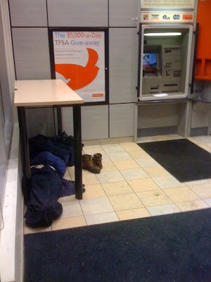 Tonight after a failed attempt to go to the rock climbing gym (it was filled with a birthday party, climbing class and everyone else) I went to the bank. Low and behold, the banker was snoring right next to the ATM! Now that is juxtaposition!