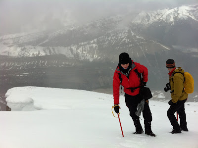 On Saturday we climbed Sunwapta Peak in Jasper National Park. It was an early start as we were hiking by 7:30am. The trail as you leave the Icefields Parkway climbs steeply up the south watershed through the mosquito-infested forest. There is a beautiful canyon with some interesting rock formations as one follows the trail to the north of the creek. When we broke out of the trees we were greeted with scree with snowy patches that stretched up into the cloudy abyss. Shortly, all the scree was covered with snow. From there it was one foot after the other. Often the only sounds were the crunch of boot on snow, the metallic clink of the ice axe and our own laboured breath. The last few hundred meters were near white-out as the cloud had meshed neatly with the snow.My eyes played tricks on me as I squinted into the flat white. Swirls and spots appeared in the whiteness, a rock blinked red like an avalanche beacon, and distances that were only a few meters seemed immensely further. When we finally reached the summit, due to the rarified air, it took us a moment to collectively decide whether it was indeed the place!